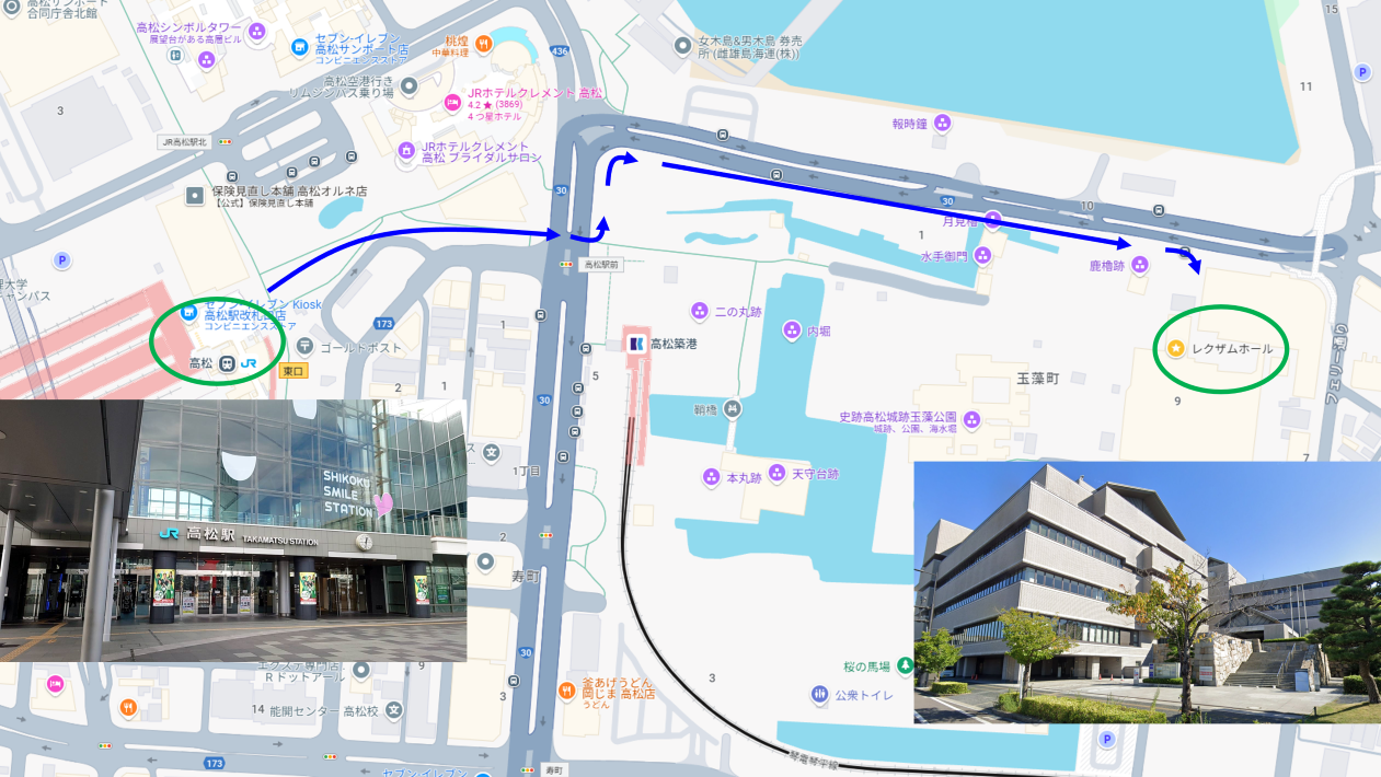 会場から南に少し離れますが(徒歩15~20分,または「ことでん」利用),瓦町駅や商店街の周辺はホテル・飲食店が多いので宿泊先としておすすめです.